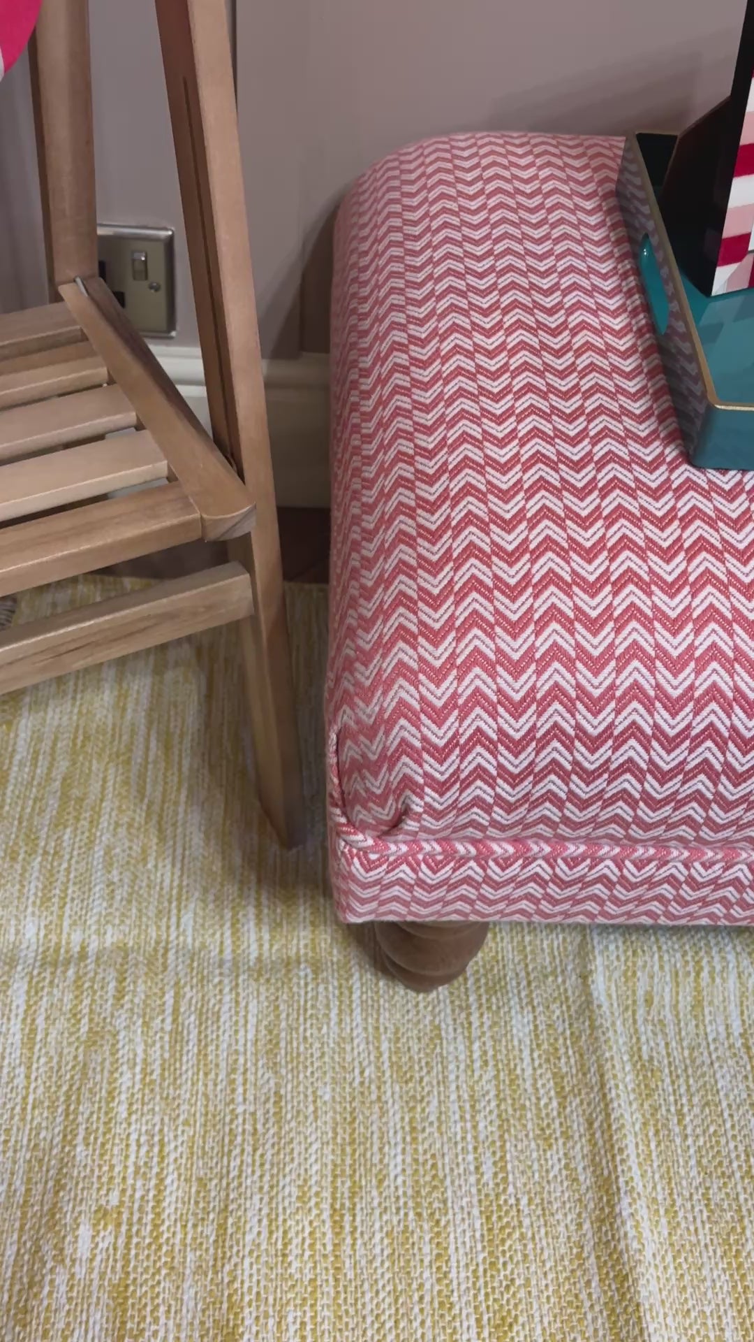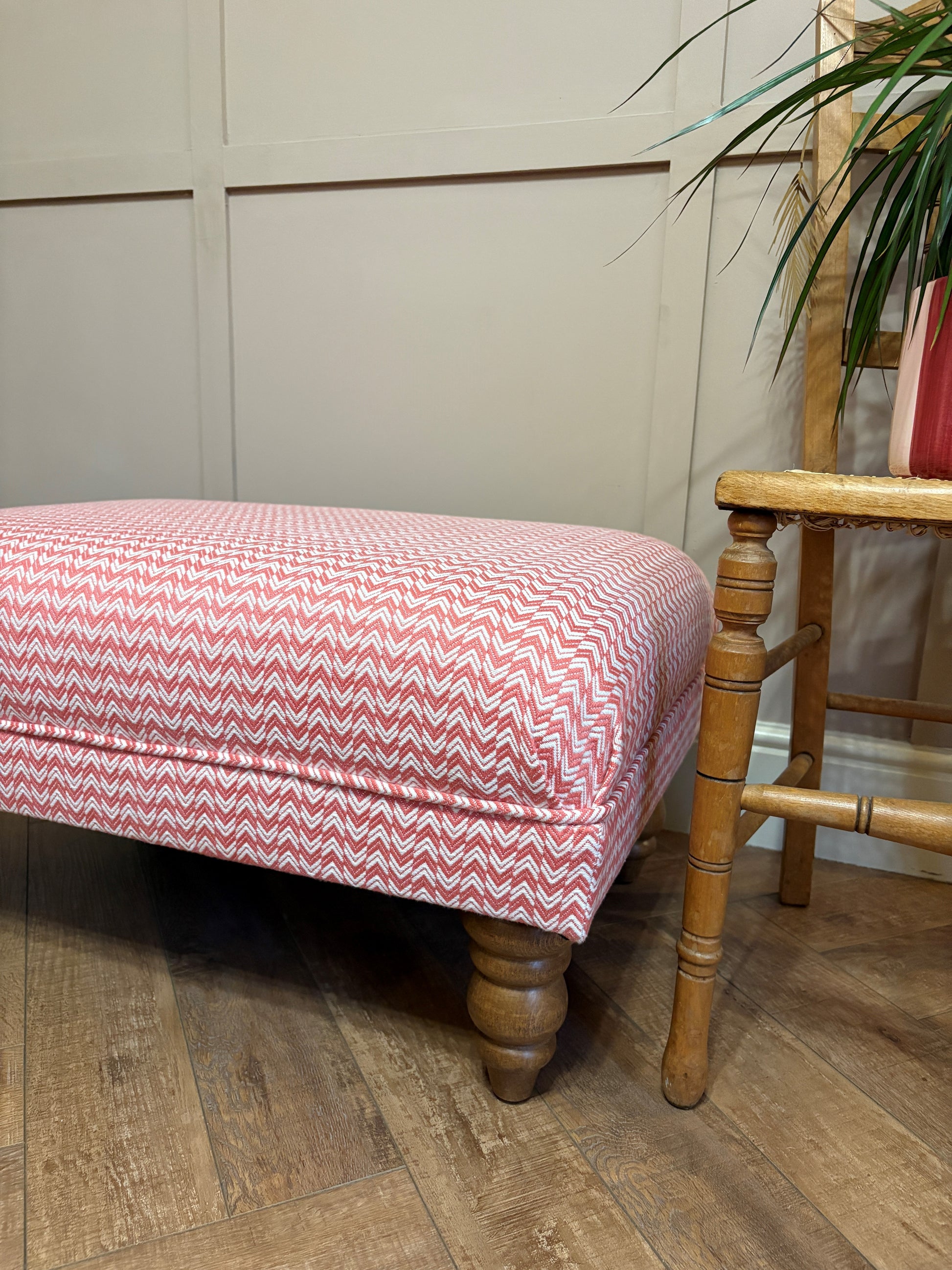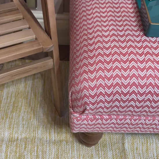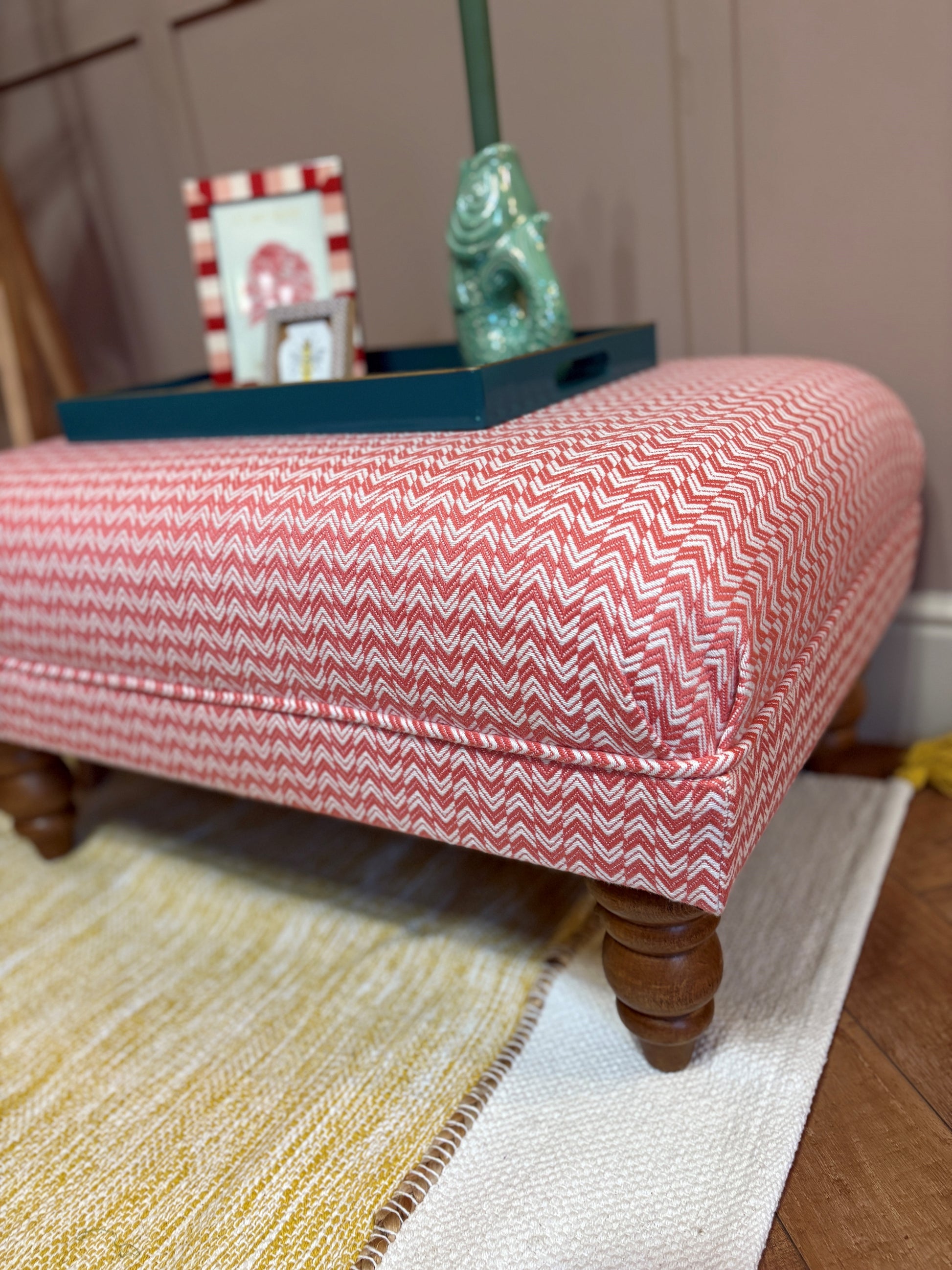 A beautiful footstool handcrafted and upholstered using Sanderson Herringbone fabric in Coral, finished with classic self-piping detail.