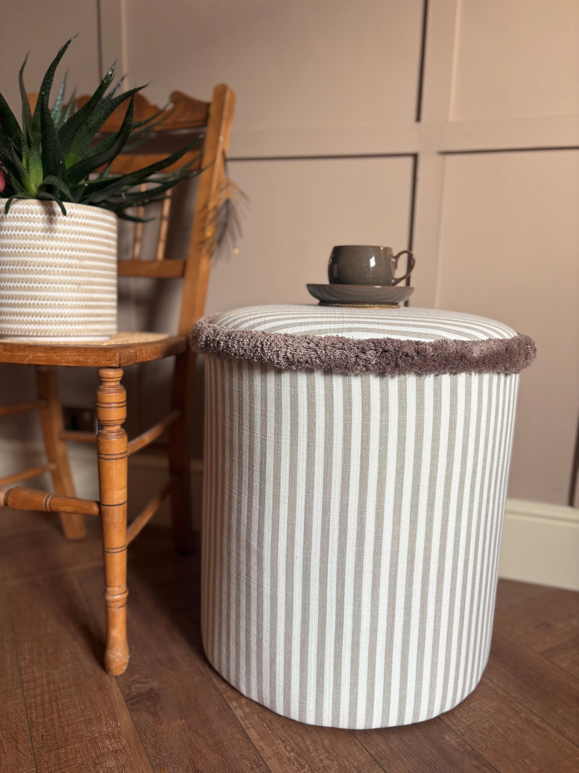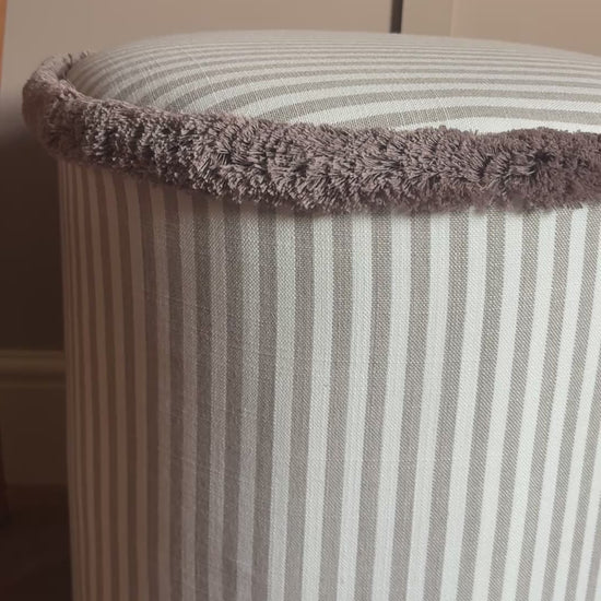 Handcrafted dressing table pouffe upholstered in classical stripe fabric by Maria Flora - Ordito Taupe.